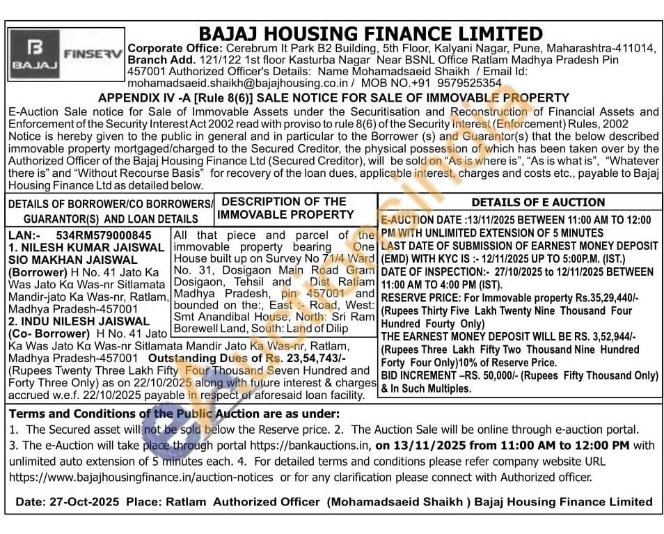 All that piece and parcel of the immovable property bearing One House built up on Survey No 71/4 Ward No. 31, Dosigaon Main Road Gram Dosigaon, Tehsil and Dist Ratiam Madhya Pradesh, pin 457001 and bounded on the:, East Road, West: Smt Anandibal House, North: Sri Ram Borewell Land, South: Land of Dilip