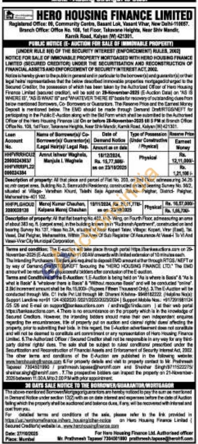 Description of property: All that plece and parcel of Flat No. 203. on 2nd Floor, acneesuring 34.25 snir corpel area. Bulding No.3, Serraddhi Residency, constructed on land beering Survey No. 562. shusted at Village-Malossits- Tal palghar, Dist Palghar 401 102