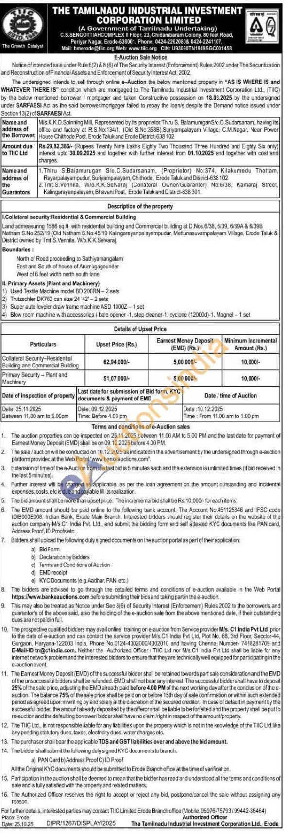 Land admeasuring 1588 sqft with residential building and Commerce bulding at D Nos-538, 508, 6394 & 3 Natham 8. No.252/19 (Old Nathan 5 No 45/19 Kainga Kalinganyanaput Methan Mithunasavam palayan Vilage. Erode Tauk& District owned by Tmt.S. Wenna WoKK Selvaraj