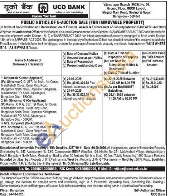 All that piece and parcel of Immovable Property Site bearing No. 257. Assessment No. 33/2, Comes under BBMP Ward No. 129, Khatha No. 221, Malathahalli Village, Yeshwanthpura Hobli, Bangalore North Taluk. Measuring: East to West 30 feet and North to South 50 feet, Totally Measuring 1500 Square Feet and bounded on: East by: Property of Smt. Padmamma, West by: Property of Mr. GT Ramaswamy, North by: 20 Ft. Road, South by: Property of Mr. T. R. S. Murthy Site. In the name of: Mr. G. Shivanna S/o. Late Gangaiah.