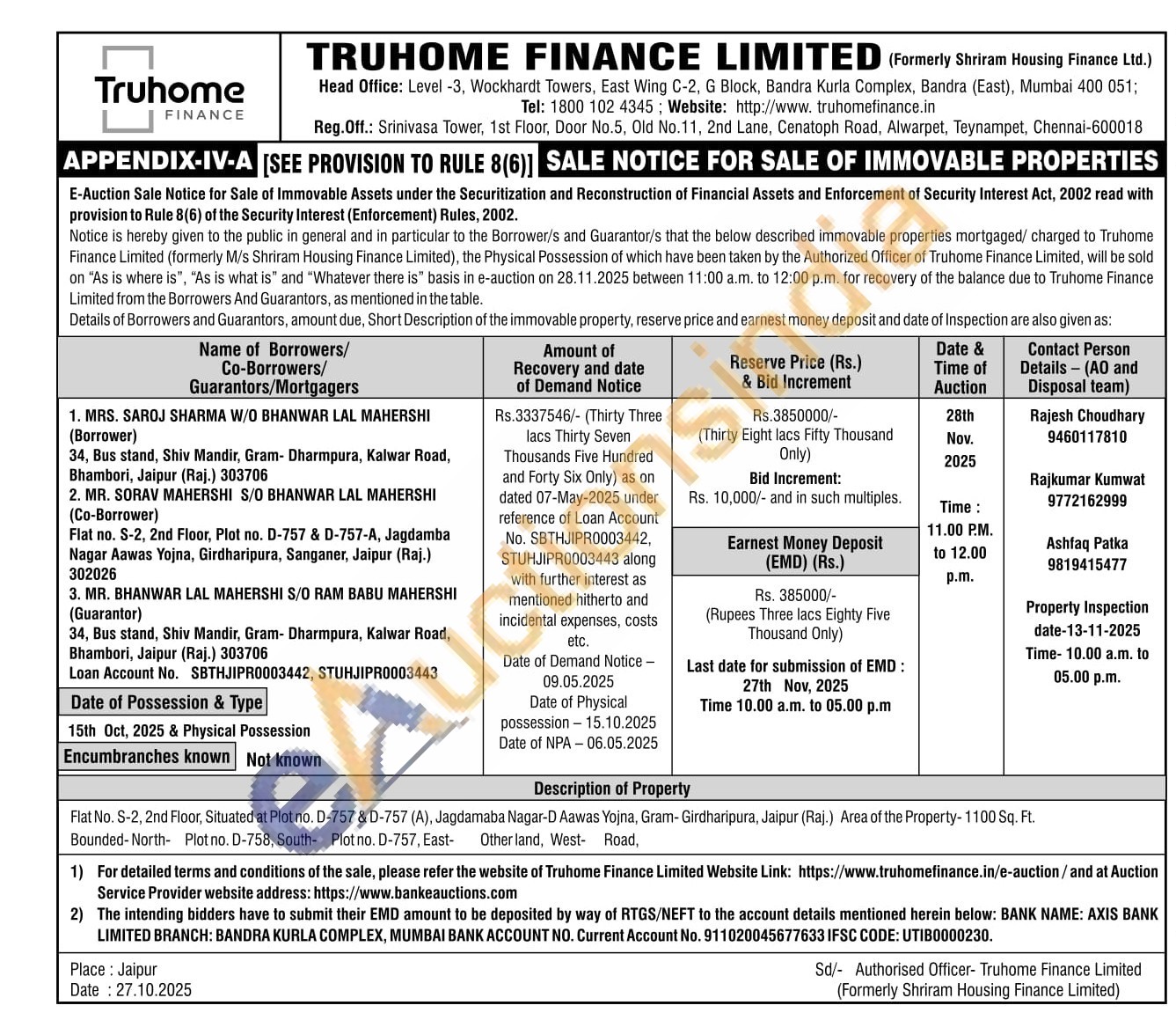 No. S-2, 2nd Floor, Situated at Plot no. D-757 & D-757 (A), Jagdamaba Nagar-D Aawas Yojna, Gram-Girdharipura, Jaipur (Raj.) Area of the Property-1100 Sq. Ft. Bounded-North- Plot no. D-758, South Plot no. D-757, East- Other land, West- Road