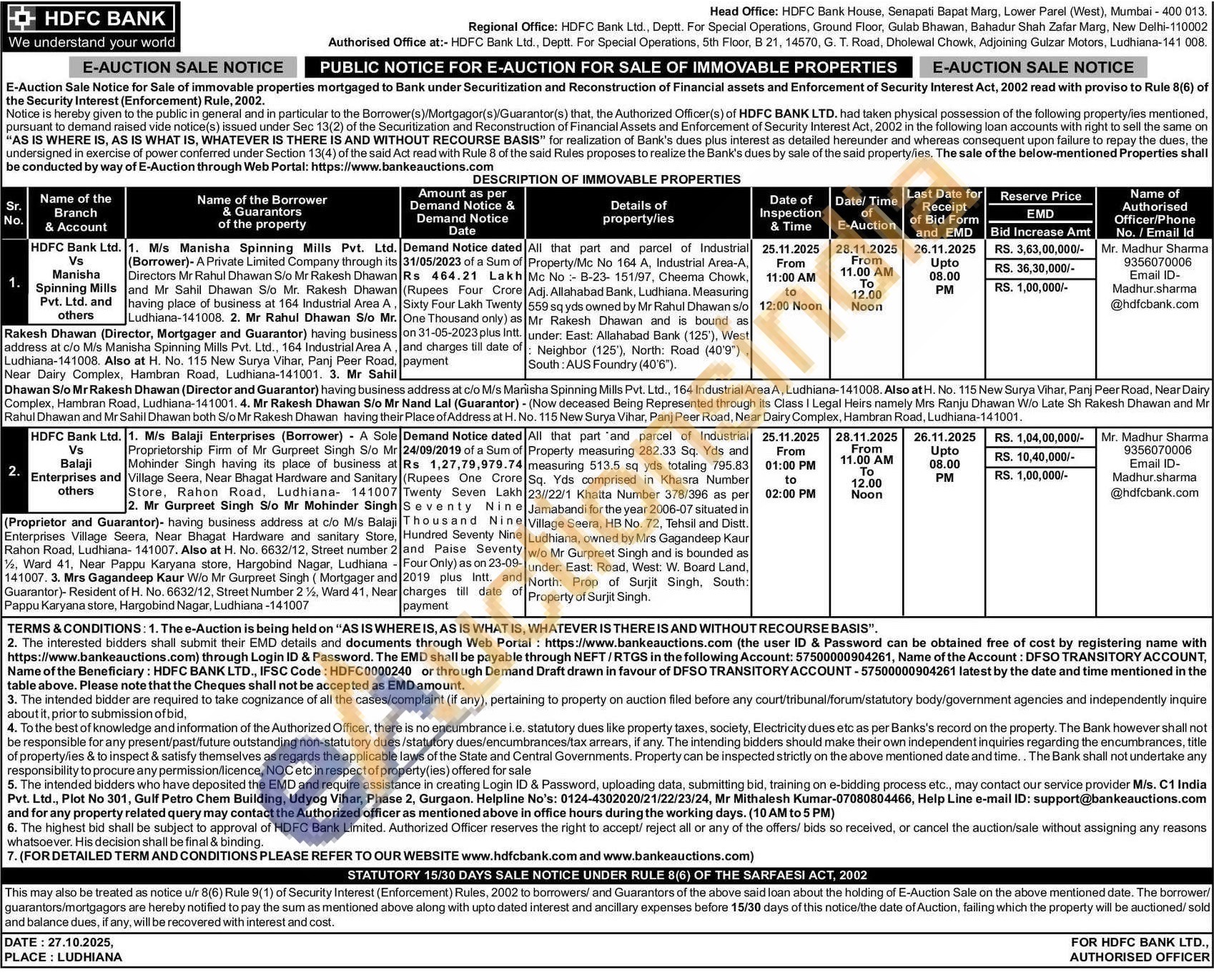 All that part and parcel of Industrial Property/Mc No 164 A, Industrial Area-A, Mc No: B-23-151/97, Cheema Chowk, Adj. Allahabad Bank, Ludhiana. Measuring 559 sq yds owned by Mr Rahul Dhawan s/o Mr Rakesh Dhawan and is bound as under: East: Allahabad Bank (125'), West Neighbor (125'), North: Road (40'9") South: AUS Foundry (40'6").