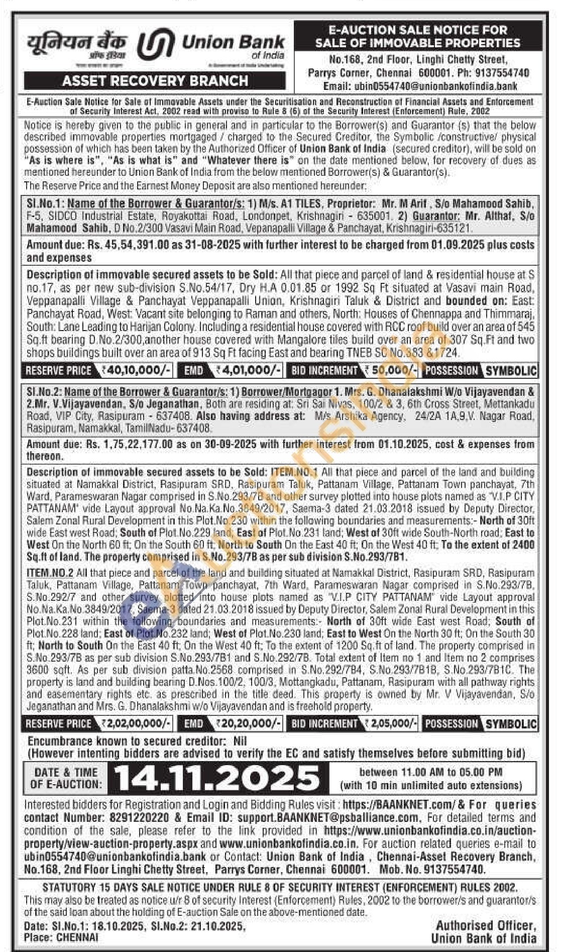 Description of immovable secured assets to be Sold: All that piece and parcel of the land and building situated at Namakkal District, Rasipuram SRD, Rasipuram Taluk, Pattanam Village, Pattanam Town panchayat, 7th Ward, Parameswaran Nagar comprised in S.No.293/7B and other survey plotted into house plots named as "VIP CITY PATTANAM' vide Layout approval No.Na.Ka. No.3849/2017, Saema-3 dated 21.03.2018 issued by Deputy Director, Salem Zonal Rural Development in this Plot.No.230 within the following boundaries and measurements.- North of 30ft wide East west Road, South of Plot. No.229 land; East of Plot. No. 231 land; West of 30ft wide South-North road, East to West On the North 60 ft. On the South 60 ft. North to South On the East 40 ft; On the West 40 ft. To the extent of 2400 Sq.ft of land. The property comprised in S.No.293/7B as per sub division S.No.293/781