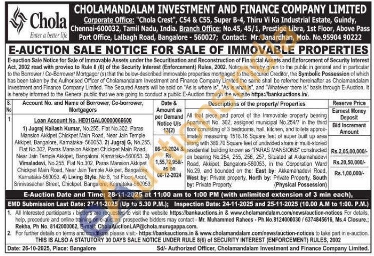 All that piece and parcel of the Immovable property bearing Apartment No. 302, assigned municipal No. 254/7 in the third floor consisting of 3 bedrooms, hall, kitchen, and toilets approx-imately measuring 1518.16 Square feet of super built up area along with 389.70 Square feet of undivided share in multi-storied residential building known as "PARAS MANSIONS constructed on bearing No.254, 255, 256, 257, Situated at Akkamahadevi Road, Chickpet , Bangalore-560053, in the Corporation Ward No.29, and bounded on the: East by: Akkamahadevi Road. by: Private Property. 06-12-2024 West by: Private property, North by: Private Property, South (Physical Possession)