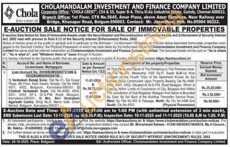 All That Piece and Parcel of The Pertaining to Flat Premises bear-ing Fiat No.401, Measuring 1000 Sq. Ft. Super Built-Up Area Located on the Fourth Floor of the Apartment Known As Sal Eshwar Plaza Constructed Upon Property Bearing Cts No.4499, 4500, 4501, 4502, Situated At Dr.S.P.M. Road Belagavi, Which is Coming Within Limits of Corporation of City, Belagavi And Within The Jurisdiction of Sub-Registrar, Belagavi And Same Is Bounded By, East: By Set Back of the Building Thereafter Service Road, West: By Flat No.402 & Passage. North: By Cts No.4498 And South: Cts No.4503.
