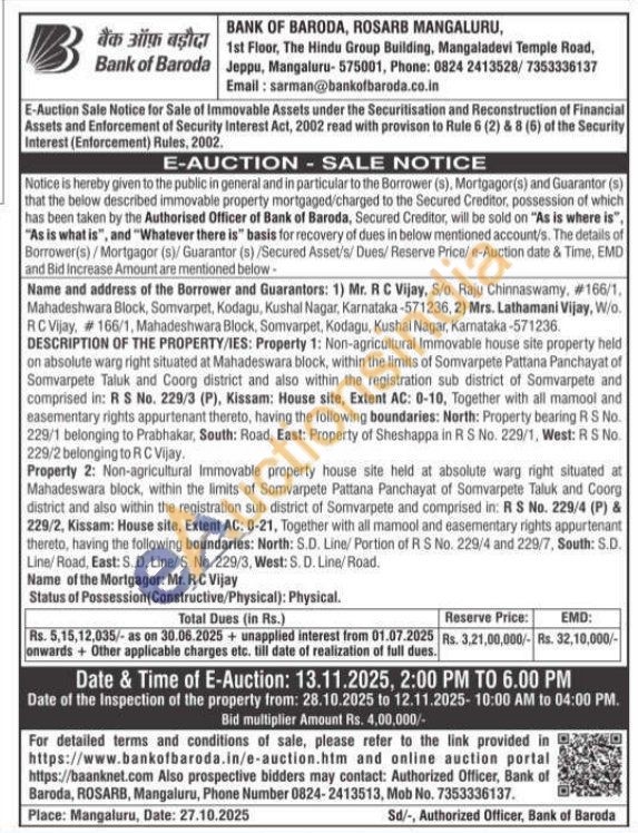 DESCRIPTION OF THE PROPERTY/IES: Property 1: Non-agricultural Immovable house site property held on absolute warg right situated at Mahadeswara block, within the limits of Somvarpete Pattana Panchayat of Somvarpete Taluk and Coorg district and also within the registration sub district of Somvarpete and comprised in: RS No. 229/3 (P), Kissam: House site, Extent AC: 0-10, Together with all mamool and easementary rights appurtenant thereto, having the following boundaries: North: Property bearing R S No. 229/1 belonging to Prabhakar, South: Road, East: Property of Sheshappa in R S No. 229/1, West: R S No. 229/2 belonging to RC Vijay. Property 2: Non-agricultural Immovable property house site held at absolute warg right situated at Mahadeswara block, within the limits of Somvarpete Pattana Panchayat of Somvarpete Taluk and Coorg district and also within the registration sub district of Somvarpete and comprised in: R S No. 229/4 (P) & 229/2, Kissam: House site, Extent AC: 0-21, Together with all mamool and easementary rights appurtenant thereto, having the following boundaries: North: S.D. Line/ Portion of R S No. 229/4 and 229/7, South: S.D. Line/Road, East: S. D. Line/S. No. 229/3, West: S. D. Line/Road.