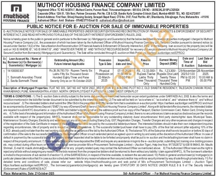 Description of Mortgaged Properties: FLAT NO 305, GAT NO 447 NEW 2922, 3RD FLOOR B 2 BUILDING PLOT NO 2, OLD SWASTIK RESIDENCY, TALEGAON CHAKAN ROAD, KHARABWADI, PUNE, MAHARASHTRA, 410501. NORTH: OPEN PLOTEAST FLAT SOUTH: LOBBY WEST: OPEN PLOT