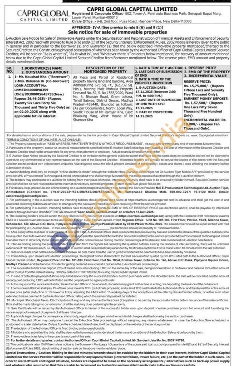 All Piece and Parcel of Residential property having land and building, Area Admeasuring 675 Sq. Ft, (62.732 Sq. Mts.), bearing Maiz Mohalla Property Demand No. 82, S. No 1585/2020, Ward No. 6. Bhasun Road, Gram Lohara, Tehsil Satwes, District Dewas, Madhya Pradesh-455-4-40, Bounded as follows: (As per Documents), North: Local Way, South: House of Mr. Ranjan Kha, East: Bhaisung Marg, West: House of Mr Shamser Kha