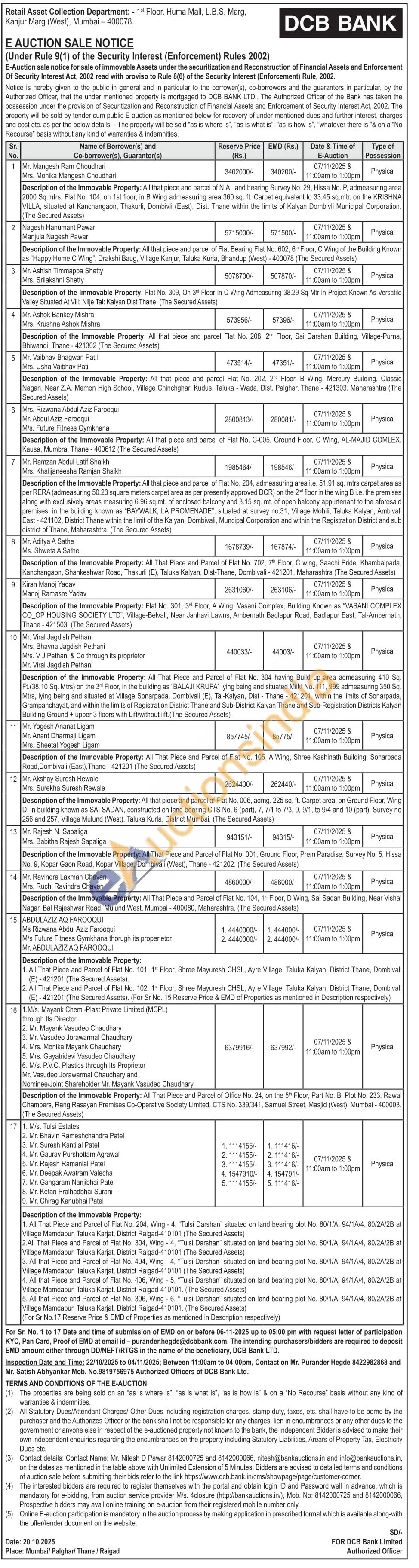 5) All that piece and parcel Flat No. 202, 2nd Floor, B Wing, Mercury Building, Classic Nagari, Near Z.A. Memon High School, Village Chinchghar, Kudus, Taluka - Wada, Dist. Palghar, Thane 421303. Maharashtra (The Secured Assets)