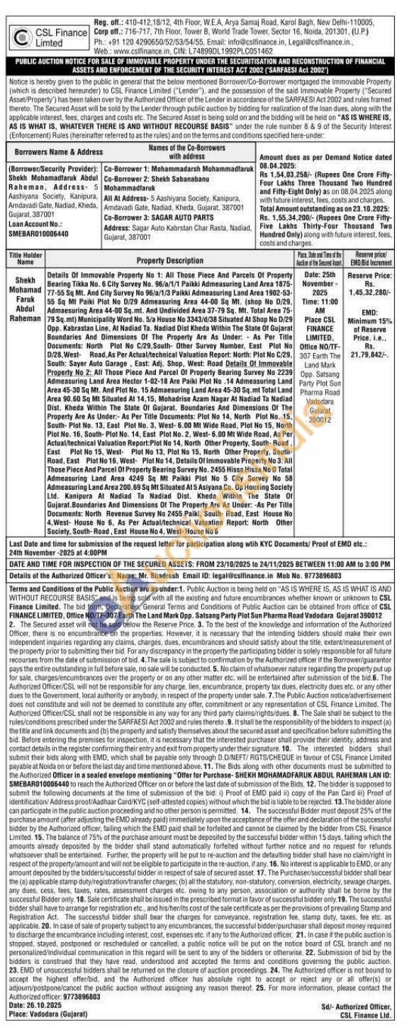 Authorized Officer's: Name: Mr. Bhadresh Email ID: legal@csifinance.in Mob No. 9773896803
