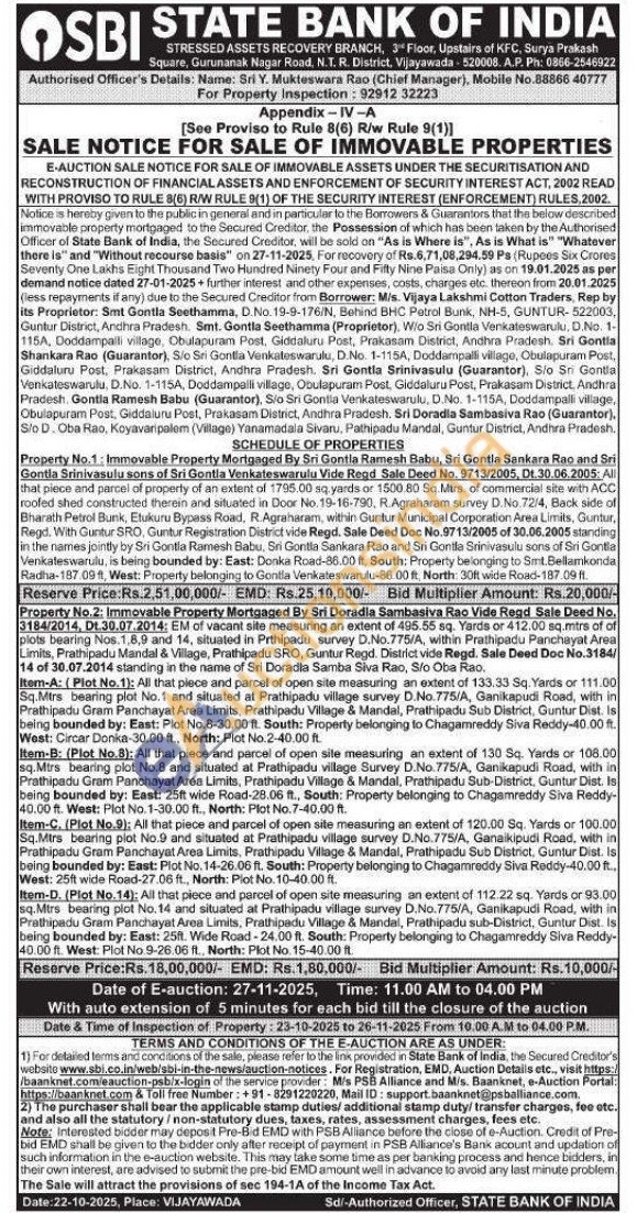 Authorised Officer's Details: Name: Sri Y. Mukteswara Rao (Chief Manager), Mobile No.88866 40777 For Property Inspection: 92912 32223