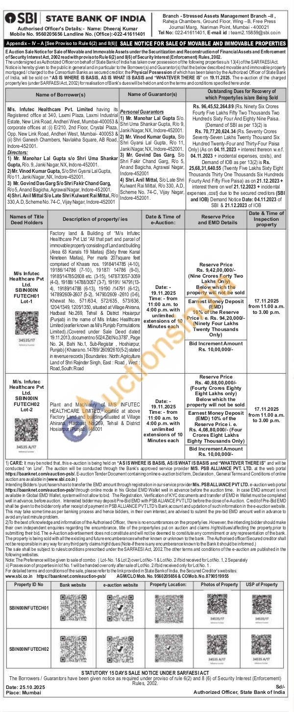 Factory land & Building of "M/s Infutec. Healthcare Pvt Ltd "All that part and parcel of immovable property consisting of Land and building (Area 63 Kanals 19 Marias) (Sixty three Kanal Nineteen Mardas), Per maria 207 square feet comprised of Khasra nos. 19184/14785 (4-10), 19186/14786 (7-10), 19187/ 14786 (9-0), 19185/14785/2608 etc. (3-15), 14787/3057-3059 (4-0), 19188/14788/3057 (3-7), 19191/14791(13-4), 19189/14788 (6-13), 19190/14791 (6-12), 14789/2609-2607 (5-2), 14790/2609-2610 (0-6). Khewat No. 571/634, 572/635, 573/636, 1204/1349, 1205/1350, situated at Village Ahirana, Hadbast No.269, Tehsil & District Hosiarpur (Punjab) in the name of M's Infutec Healthcare Limited (earlier known as M/s Punjab Formulations Limited). (Covered under Sale Deed dated 19.11.2013, documentno 5024 Zid No.3787, Page No. 24, Bahi No.1, Sub-Registar, Hoshiarpur, Punjab) (Khasrano. 14789/2609/2610(5-2) stated in revenue records} Boundaries: North: Agriculture Land of Shri Rajinder Singh, East: Road, West: Road, South: Road