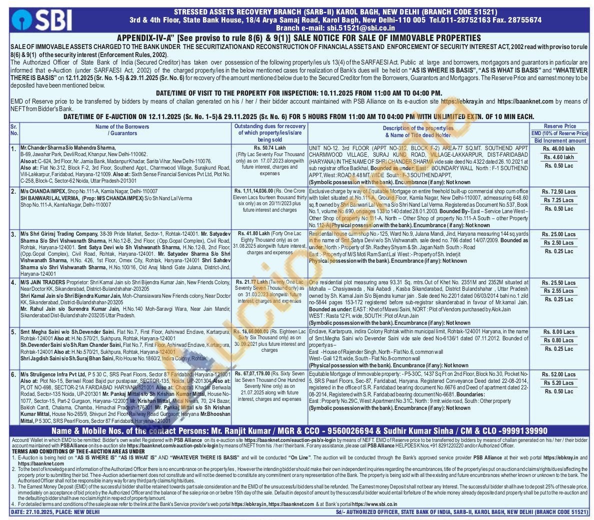 Equitable Mortgage of Immovable property:-P5-30C, 1437 Sq Ft on 2nd Floor, Block No.30, Pocket No-5, SRS Pearl Floors, Sec-87, Faridabad, Haryana. Registered Conveyance Deed dated 22-08-2014, registered in the office of S.R. Faridabad bearing document No.6676 and Deed of apartment dated 22-08-2014, Registered with S.R. Faridabad bearing document No-6681. Boundaries: East: Property No.29C, West: Apartment No.31C, North: 9 mtr wide road, South: Other property (Symbolic possession with the bank). Encumbrance (if any): Not known