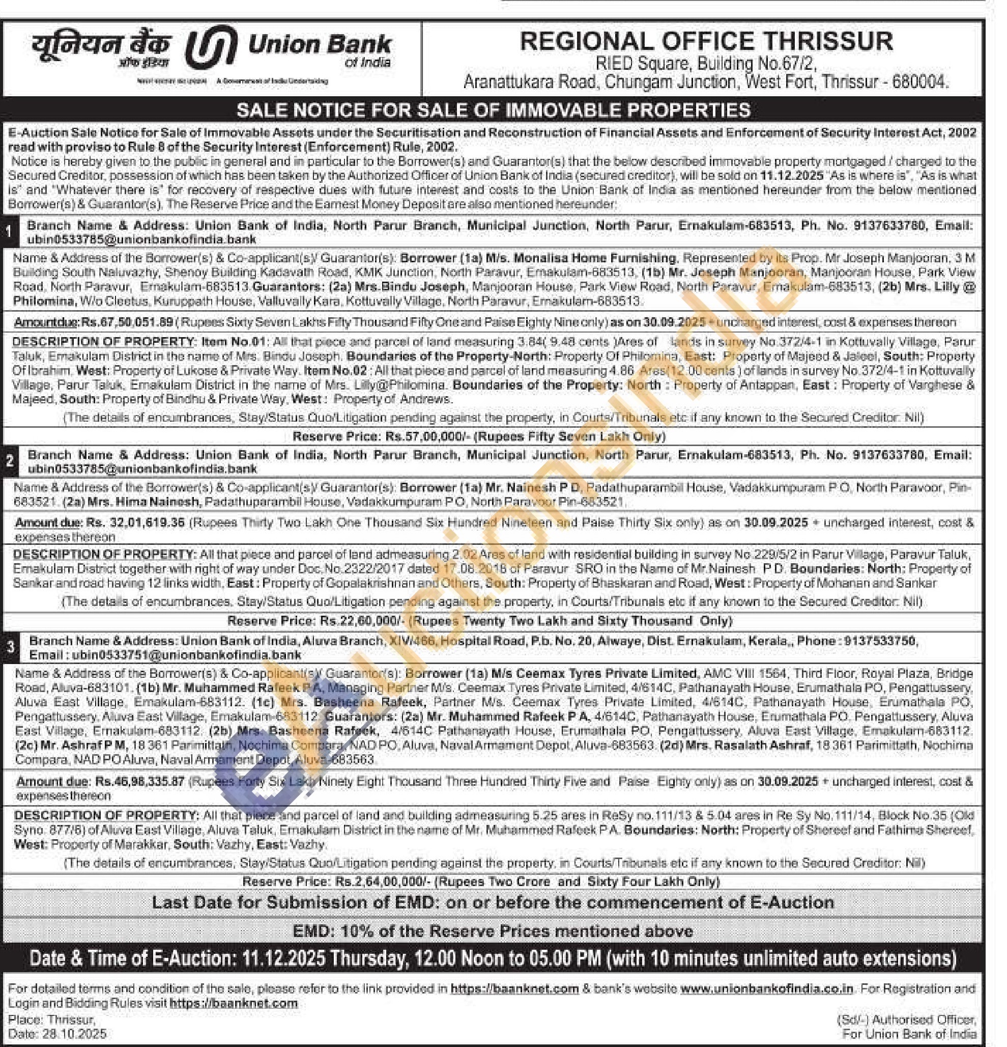 All that piece and parcel of land and building admeasuring 5.25 ares in ReSy no. 111/13 & 5.04 ares in Re Sy No. 111/14, Block No.35 (Old Syno. 877/6) of Aluva East Village, Aluva Taluk, Ernakulam District in the name of Mr. Muhammed Rafeck PA. Boundaries: North: Property of Shereef and Fathima Shereef, West: Property of Marakkar, South: Vazhy, East: Vazhy