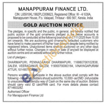Manappuram Finance Ltd Gold Auctions Auction in Dharmapuri