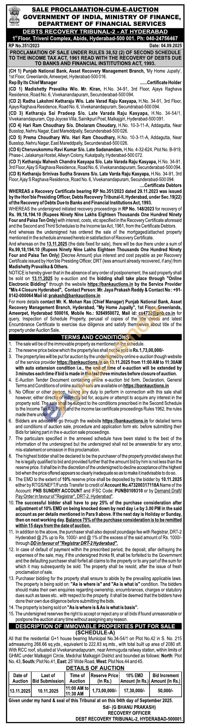 All that the residential G+1 house bearing Municipal No.34-54/1 on Plot No.42 in S. No. 215 admeasuring 266.66 sq.yds., equivalent to 222.83 sq.mts., with total built up area of 2080 sft. With RCC roof, situated at Vivekananadapuram, near Ammuguda railway station, within limits of GHMC under Malkajgiri Circle, Medchal Malkajgiri District and bounded as follows: North: Plot No. 43, South: Plot No.41, East: 25' Wide Road, West: Plot Nos. 44 and 45.