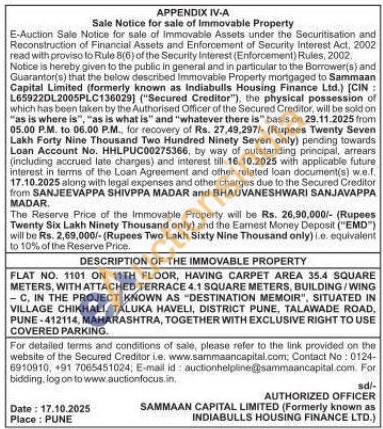 FLAT NO. 1101 ON 11TH FLOOR, HAVING CARPET AREA 35.4 SQUARE METERS, WITH ATTACHED TERRACE 4.1 SQUARE METERS, BUILDING/WING C. IN THE PROJECT KNOWN AS "DESTINATION MEMOIR", SITUATED IN VILLAGE CHIKHALI, TALUKA HAVELI, DISTRICT PUNE, TALAWADE ROAD, PUNE-412114, MAHARASHTRA, TOGETHER WITH EXCLUSIVE RIGHT TO USE COVERED PARKING.