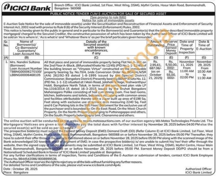 All that piece and parcel of immovable property being Flat No. A-301 on the 2nd Floor A-Block, (Bifurcated Khata No 12/45) (PID No 1-1-12/45) of the building known as "Vinyaas Virtue" constructed on the immovable property bearing Sy. No.70/4, (vide Conversion Order No. BDA/ALN/SR (AN) 262/92-93 dated 1-8-1995 issued by the Special District Commissioner, Bangalore District) Presently bearing BBMP Khata No. 12, (PID No. 1-1-12) situated at I Main Road, Jalahalli Village, Yeshwanthpur Hobli, Bangalore North Taluk, in terms of the sanctioned plan vide LP No.1316/2014-15 dated 16-3-2015 issued by the Bruhat Bangalore Mahanagara Palike consisting of hall cum dining room, Five bed rooms, kitchen, bathrooms and toilets, balconies etc., along with common areas and facilities attributable thereto with a super built up area of 6198 Sq. Feet along with exclusive use of terrace area measuring 2240 Sq. Feet and 6 Car Parking lots in the Stilt Floor/ Basement for the exclusive use of the purchaser and is bounded by: On the East: Road, On the West: Church Property. On the North: Property belonging to Puttanagappa and others, On the South: Property belonging to Smt. Chanamma and others.