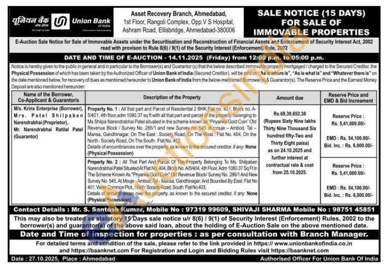 Property No. 2: At That Part And Parcal Of The Property Belonging To Ms. Shilpaben Narendrabhai Patel Situated At Flat No. 404, Block No. A/5/404, 4th Floor, Adm 1080.37 Sq Ftin The Scheme Known As "Priyanka Gold Coin" Old Revenue Block/ Survey No. 288/1 And New Survey No. 545, At Mouje-Ambod, Tal-Mansa, Gandhinagar, And Bounded By East Flat No 401, West: Common Plot North: Society Road, South: Flat No 403,