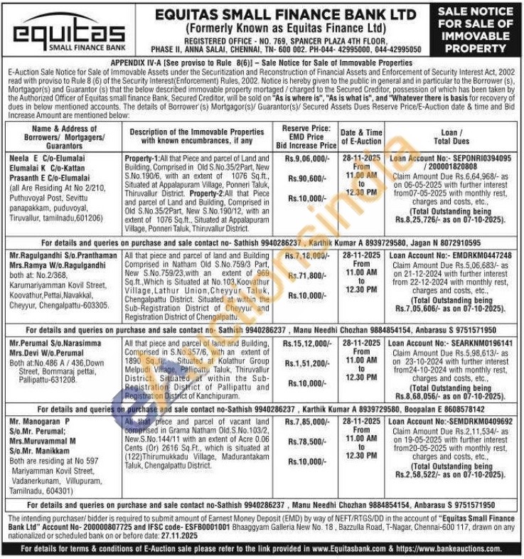 Property-1:All that Piece and parcel of Land and Building, Comprised in Old S.No.35/2Part, New S.No.190/6, with an extent of 1076 Sq.ft., Situated at Appalapuram Village, Ponneri Taluk, Thiruvallur District. Property-2:All that Piece and parcel of Land and Building, Comprised in Old S.No.35/2Part, New S.No. 190/12, with an extent of 1076 Sq.ft., Situated at Appalapuram Village, Ponneri Taluk, Thiruvallur District