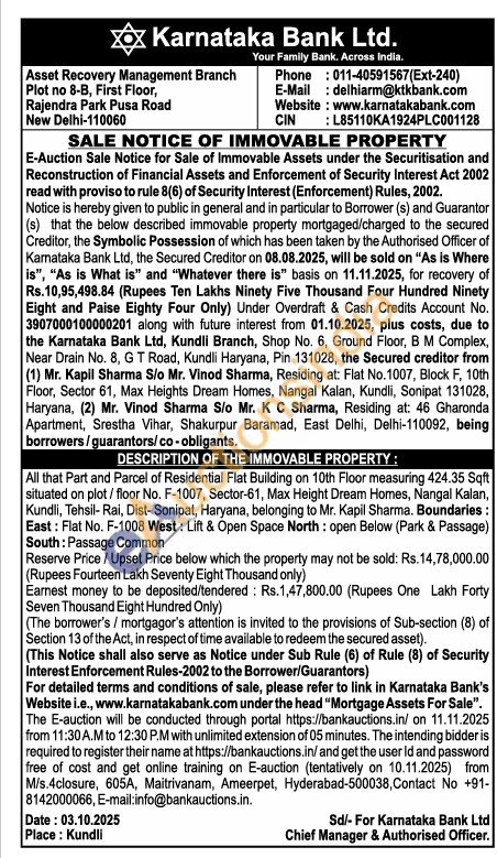All that Part and Parcel of Residential Flat Building on 10th Floor measuring 424.35 Sqft situated on plot/floor No. F-1007, Sector-61, Max Height Dream Homes, Nangal Kalan, Kundli, Tehsil- Rai, Dist- Sonipat, Haryana, belonging to Mr. Kapil Sharma. Boundaries: East: Flat No. F-1008 West: Lift & Open Space North: open Below (Park & Passage) South: Passage Common