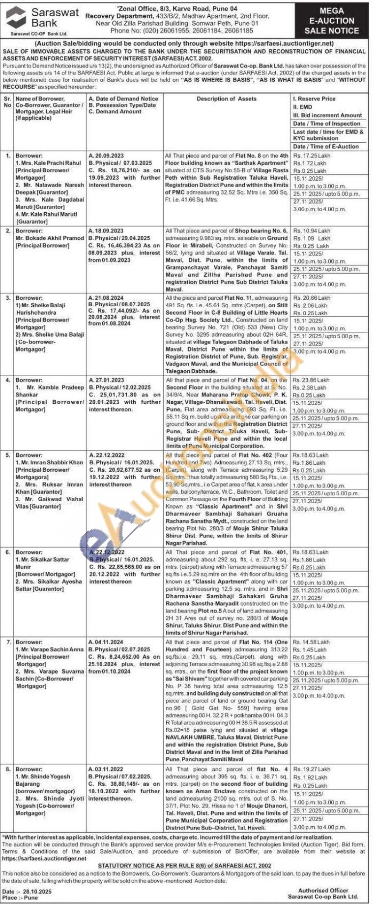 All that piece and parcel of Flat No. 04, on the Second Floor in the building situated at S. No. 34/9/4, Near Maharana Pratap Chowk, P. Κ. Nagar, Village-Dhanakawadi, Tal. Haveli, Dist. Pune, Flat area admeasuring 593 Sq. Ft. le 55.11 Sq.m. build up area and one car parking on ground floor and within the Registration District Pune, Sub-District Taluka Haveli, Sub-Registrar Haveli Pune and within the local limits of Pune Municipal Corporation.