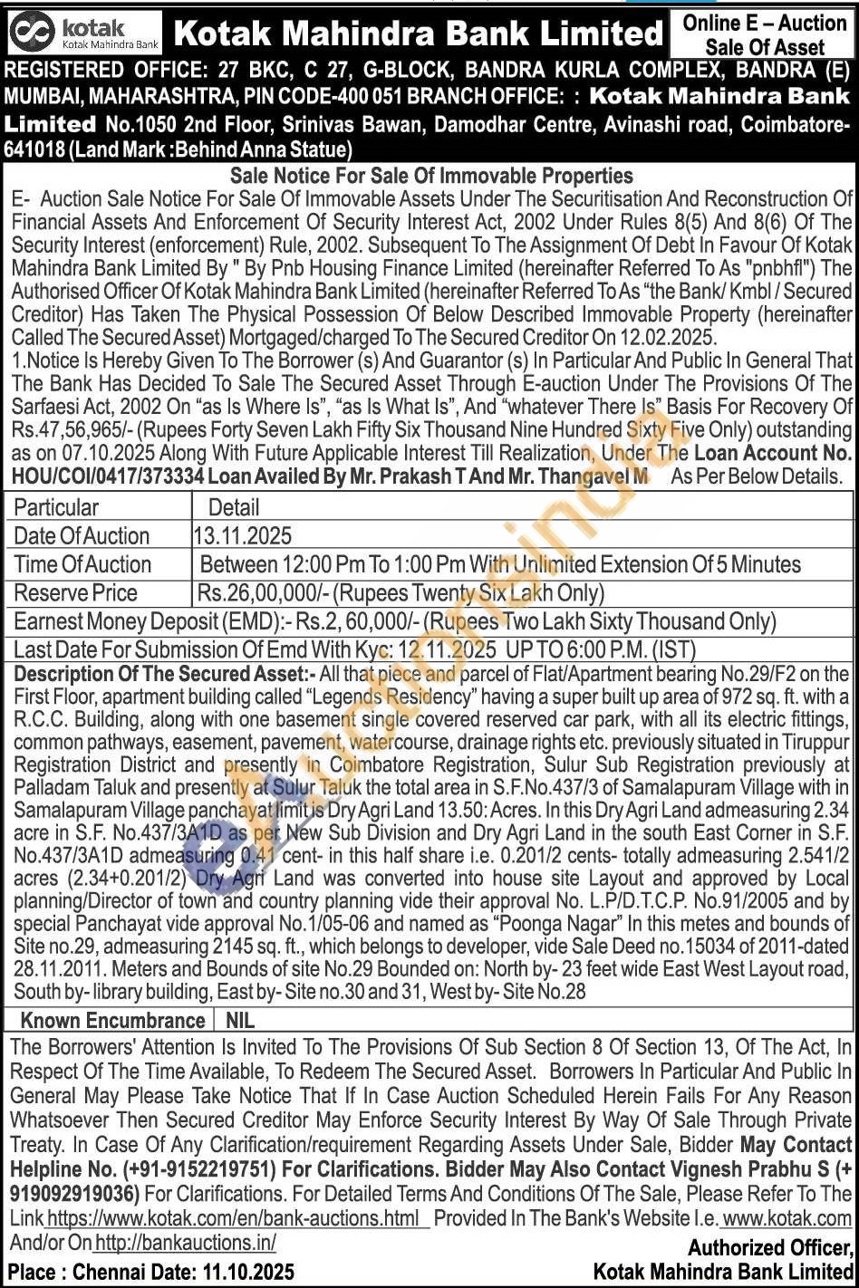 All that piece and parcel of Flat/Apartment bearing No.29/F2 on the First Floor, apartment building called "Legends Residency" having a super built up area of 972 sq. ft. with a R.C.C. Building, along with one basement single covered reserved car park, with all its electric fittings, common pathways, easement, ment, pavement, watercourse, drainage rights et drainage rights etc. previously situated in Tiruppur Registration District and presently in Coimbatore Registration, Sulur Sub Registration previously at Palladam Taluk and presently at Sulur Taluk the total area in S.F.No.437/3 of Samalapuram Village with in Samalapuram Village panchayat limit is Dry Agri Land 13.50: Acres. In this Dry Agri Land admeasuring 2.34 acre in S.F. No.437/3A1D as per New Sub Division and Dry Agri Land in the south East Corner in S.F. No.437/3A1D admeasuring 0.41 cent- in this half share i.e. 0.201/2 cents- totally admeasuring 2.541/2 acres (2.34+0.201/2) Dry Agri Land was converted into house site Layout and approved by Local planning/Director of town and country planning vide their approval No. L.P/D.T.C.P. No.91/2005 and by special Panchayat vide approval No. 1/05-06 and named as "Poonga Nagar" In this metes and bounds of Site no.29, admeasuring 2145 sq. ft., which belongs to developer, vide Sale Deed no. 15034 of 2011-dated 28.11.2011. Meters and Bounds of site No.29 Bounded on: North by- 23 feet wide East West Layout road, South by-library building, East by-Site no.30 and 31, West by-Site No.28