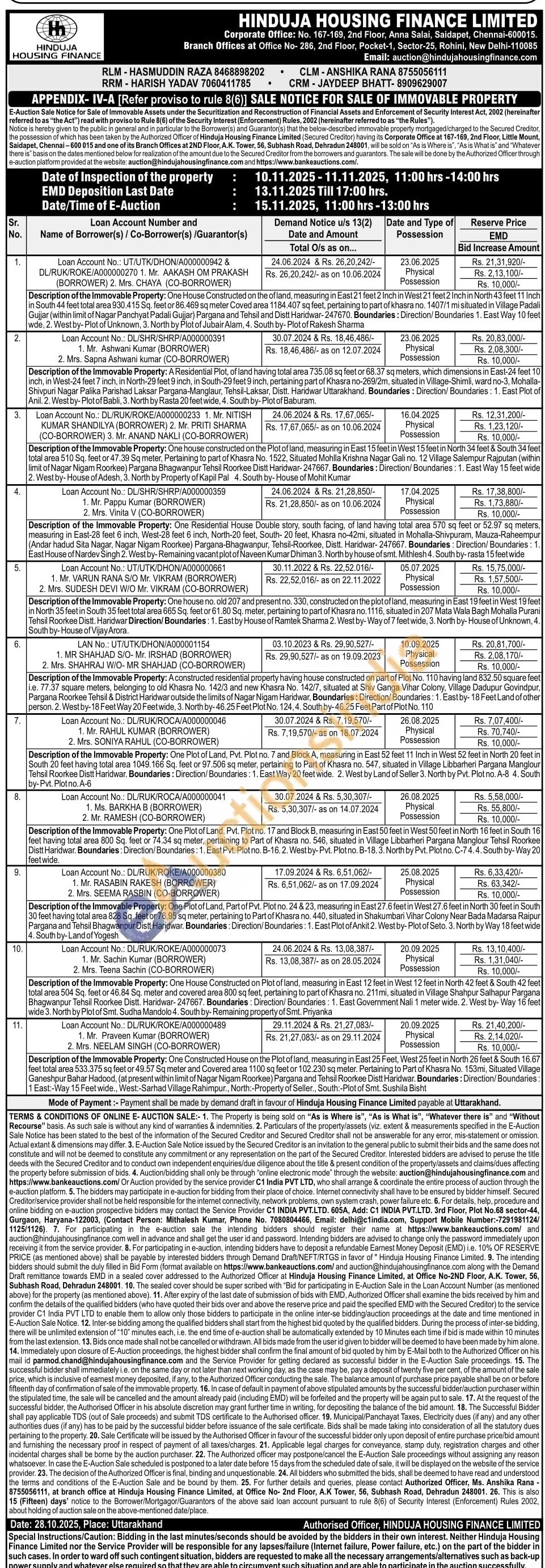 Description of the Immovable Property: One Plot of Land, Pvt. Plot no. 17 and Block B, measuring in East 50 feet in West 50 feet in North 16 feet in South 16 feet having total area 800 Sq. feet or 74.34 sq meter, pertaining to Part of Khasra no. 546, situated in Village Libbarheri Pargana Manglour Tehsil Roorkee Distt Haridwar, Boundaries: Direction/Boundaries: 1. East Pvt. Plot no. B-16. 2. Westby-Pvt. Plotno. B-18. 3. North by Pvt. Plotno. C-74.4. South by-Way 20 feet wide.