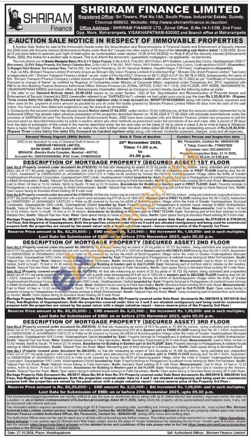 Item No.5 (Property covered under document No.575/2010): All that site measuring an extent of 25 Sq yards or 20.903 Sq. meters., being undivided and unspecified share out of 371 Sq yards together with residential Unit with a plinth area admeasuring 975 sft out of 1950 sft in Eastern part in FIRST FLOOR bearing door No.58-1-332/2, Assesment no. 100005/50281 of JAGANNADH CASTLES in Patta no.98 covered by Survey No.44/2A of Butchirajupalem Village within the limits of Greater Visakhapatnam Muncipal Corporation, Gopalapatnam SRO Limits, Visakhapatnam District bounded by: East: Property belongs to Pedagadivaru & slabbed house belongs to Middi Simhachalam, South: Tatipudi Pipe line Road, West: Slabbed House belong to Palla Sannibabu, North: Bowdara Road existing 90 ft wide Road. Measurements: East to West: 44 feet or 13.42 meters, North to South: 76 feet or 23.16 meters. Boundaries for Building in Eastern part in FIRST FLOOR: East: Property belongs to Pedagadivaru & slabbed house belongs to Middi Simhachalam, South: Tatipudi Pipe line Road, West: Remaining part of first floor belongs to Geda Manjula Devi, North: Open space facing to Bowdara Road existing 90 ft wide road