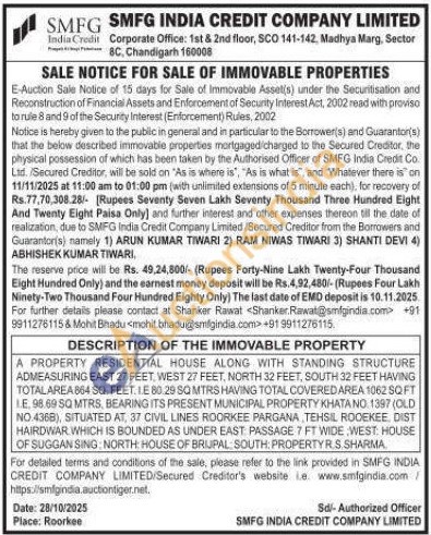 A PROPERTY RESIDENTIAL HOUSE ALONG WITH STANDING STRUCTURE ADMEASURING EAST 27 FEET, WEST 27 FEET, NORTH 32 FEET, SOUTH 32 FEET HAVING TOTALAREA864 SQ. FEET. LE 80.29 SQ MTRS HAVING TOTAL COVERED AREA 1062 SQFT LE. 98.69 SQ MTRS, BEARING ITS PRESENT MUNICIPAL PROPERTY KHATA NO 1397 (OLD NO.4368), SITUATED AT, 37 CIVIL LINES ROORKEE PARGANA TEHSIL ROCEKEE DIST HAIRDWAR WHICH IS BOUNDED AS UNDER EAST PASSAGE 7 FT WIDE WEST: HOUSE OF SUGGAN SING, NORTH HOUSE OF BRIJPAL SOUTH, PROPERTYRS SHARMA