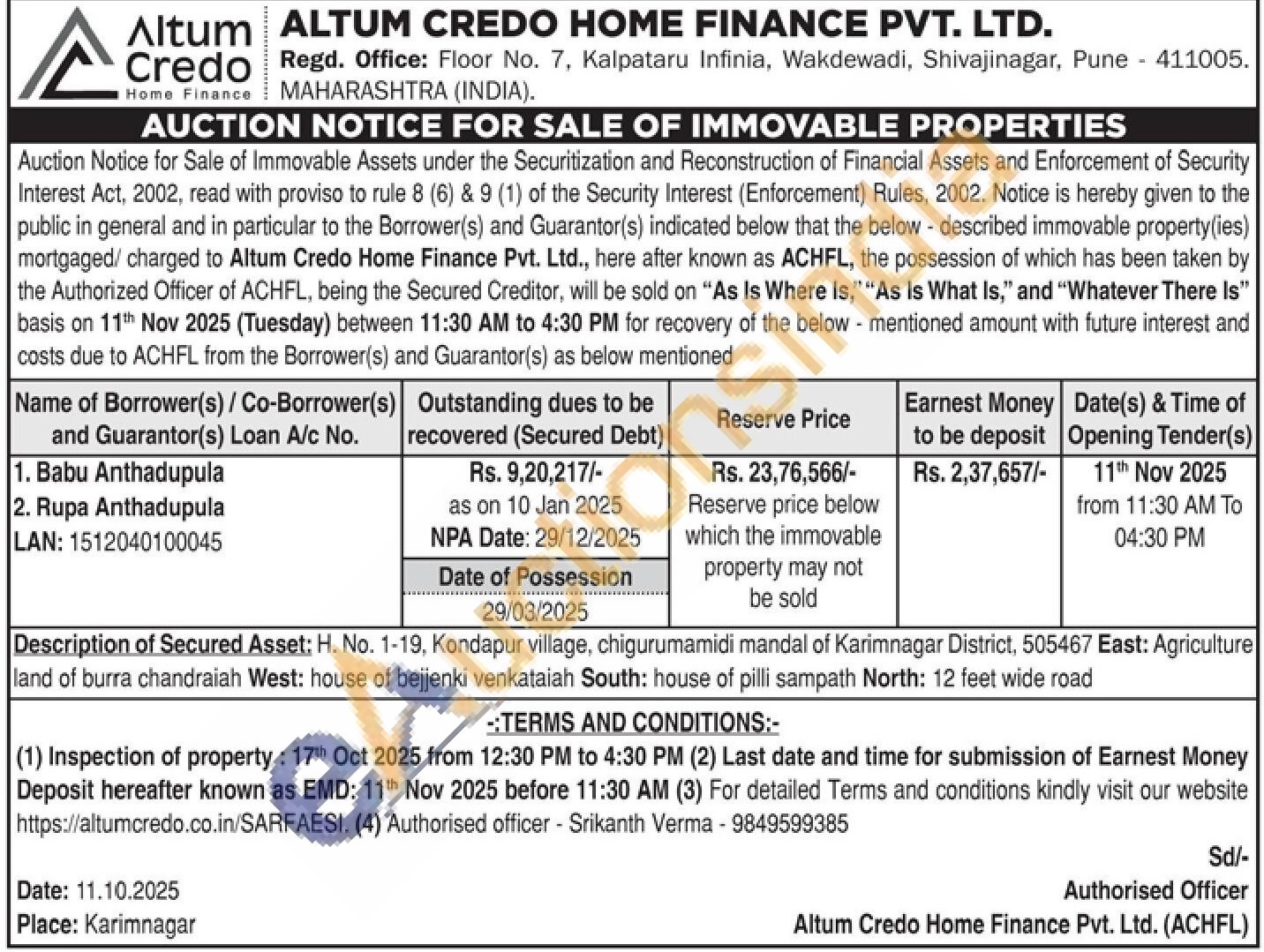 Authorised officer: Srikanth Verma -Contact No : 9849599385