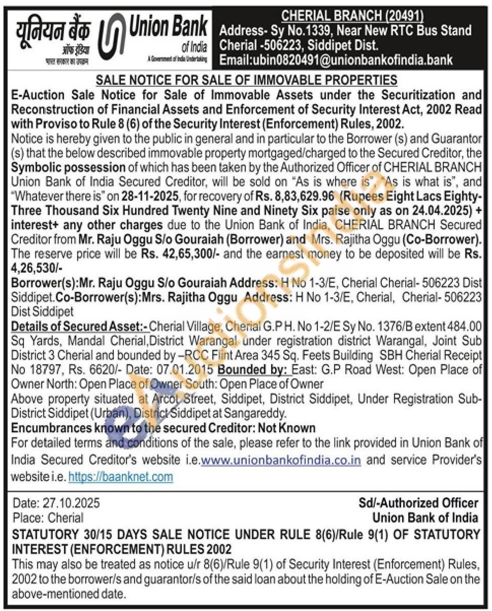 Cherial Village, Cherial G.PH. No 1-2/E Sy No. 1376/B extent 484.00 Sq Yards, Mandal Cherial, District Warangal under registration district Warangal, Joint Sub District 3 Cherial and bounded by-RCC Flint Area 345 Sq. Feets Building SBH Cherial Receipt No 18797, Rs. 6620/- Date: 07.01.2015 Bounded by: East: G.P Road West: Open Place of Owner North: Open Place of Owner South: Open Place of Owner Above property situated at Arcot Street, Siddipet, District Siddipet, Under Registration Sub-District Siddipet (Urban), District Siddipet at Sangareddy.