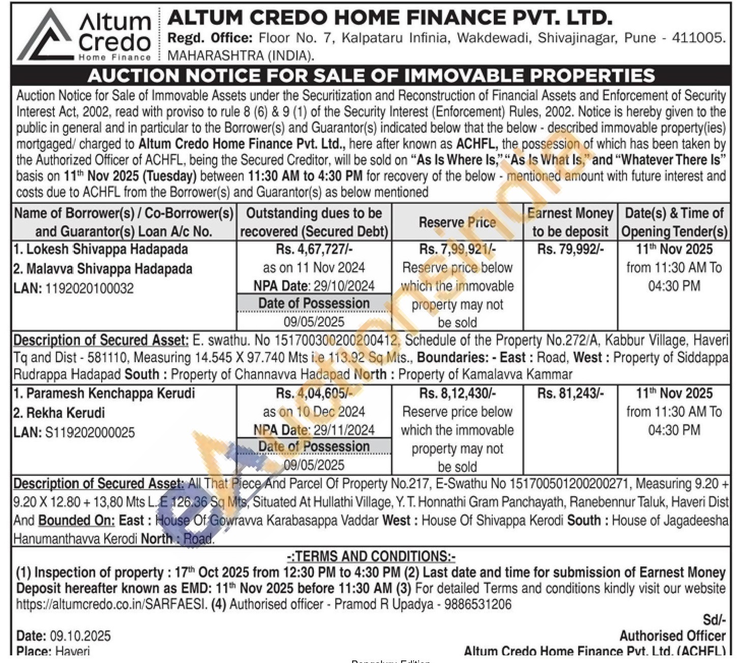 Description of Secured Asset: All That Piece And Parcel Of Property No.217, E-Swathu No 151700501200200271, Measuring 9.20 + 9.20 X 12.80 +13,80 Mts L. E 126.36 Sq Mts, Situated At Hullathi Village, Y. T. Honnathi Gram Panchayath, Ranebennur Taluk, Haveri Dist And Bounded On: East: House Of Gowravva Karabasappa Vaddar West: House Of Shivappa Kerodi South: House of Jagadeesha Hanumanthavva Kerodi North: Road