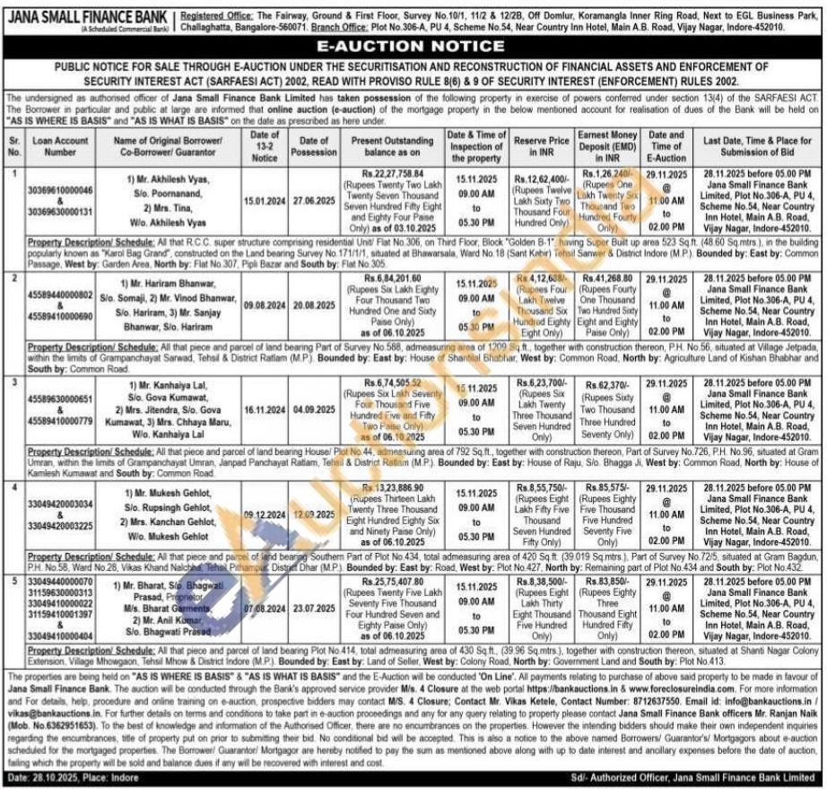 Property Description/ Schedule: All that piece and parcel of land bearing Part of Survey No 588, admeasuring area of 1209 Sq ft, together with construction thereon, PH. No. 56, situated at Village Jetpada, within the limits of Grampanchayat Sanwad, Tehsil & District Ratlam (MP). Bounded by: East by: House of Shantilal Bhabhar, West by: Common Road, North by: Agriculture Land of Kishan Bhabhar and South by: Common Road