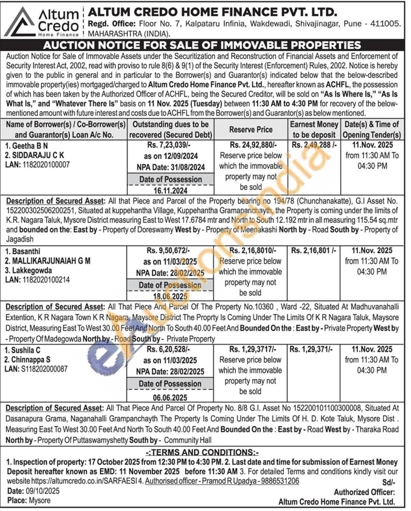 Description of Secured Asset: All That Piece And Parcel Of Property No. 8/8 G.I. Asset No 152200101100300008, Situated At Dasanapura Grama, Naganahalli Grampanchayth The Property Is Coming Under The Limits Of H. D. Kote Taluk, Mysore Dist. Measuring East To West 30.00 Feet And North To South 40.00 Feet And Bounded On the: East by - Road West by - Tharaka Road North by - Property Of Puttaswamyshetty South by - Community Hall