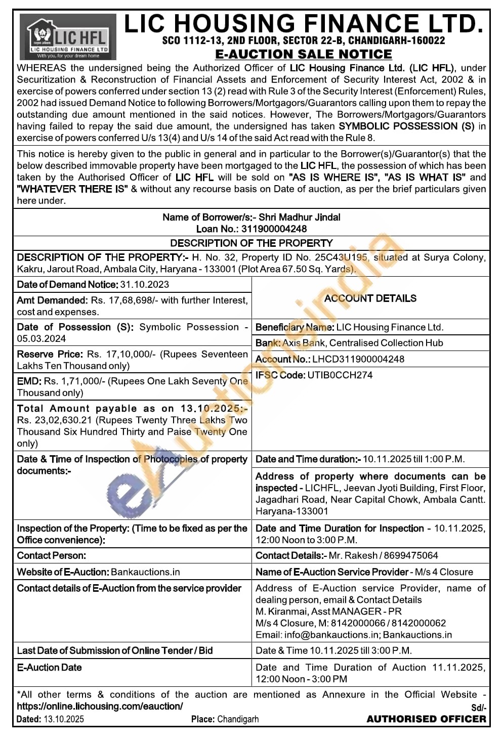 H. No. 32, Property ID No. 25C43U195, situated at Surya Colony, Kakru, Jarout Road, Ambala City, Haryana-133001 (Plot Area 67.50 Sq. Yards).