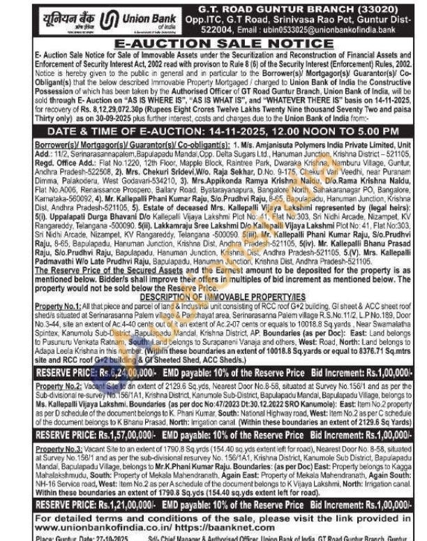 Property No.2; Vacant Site to an extent of 2129.6 Sq.yds, Nearest Door No.8-58, situated at Survey No. 156/1 and as per the Sub-divisional re-survey No. 156/1A1, Krishna District, Kanumole Sub-District, Bapulapadu Mandal, Bapulapadu Village, belongs to Ms. Kallepalli Vijaya Lakshmi. Boundaries (as per doc No: 47/2023 Dt:30.12.2022 SRO Kanumole): East: Item No.2 property as per D schedule of the document belongs to K. Phani Kumar, South: National Highway road, West: Item No.2 as per C schedule of the document belongs to K Bhanu Prasad, North: Irrigation canal (Within these boundaries an extent of 2129.6 Sq Yards)