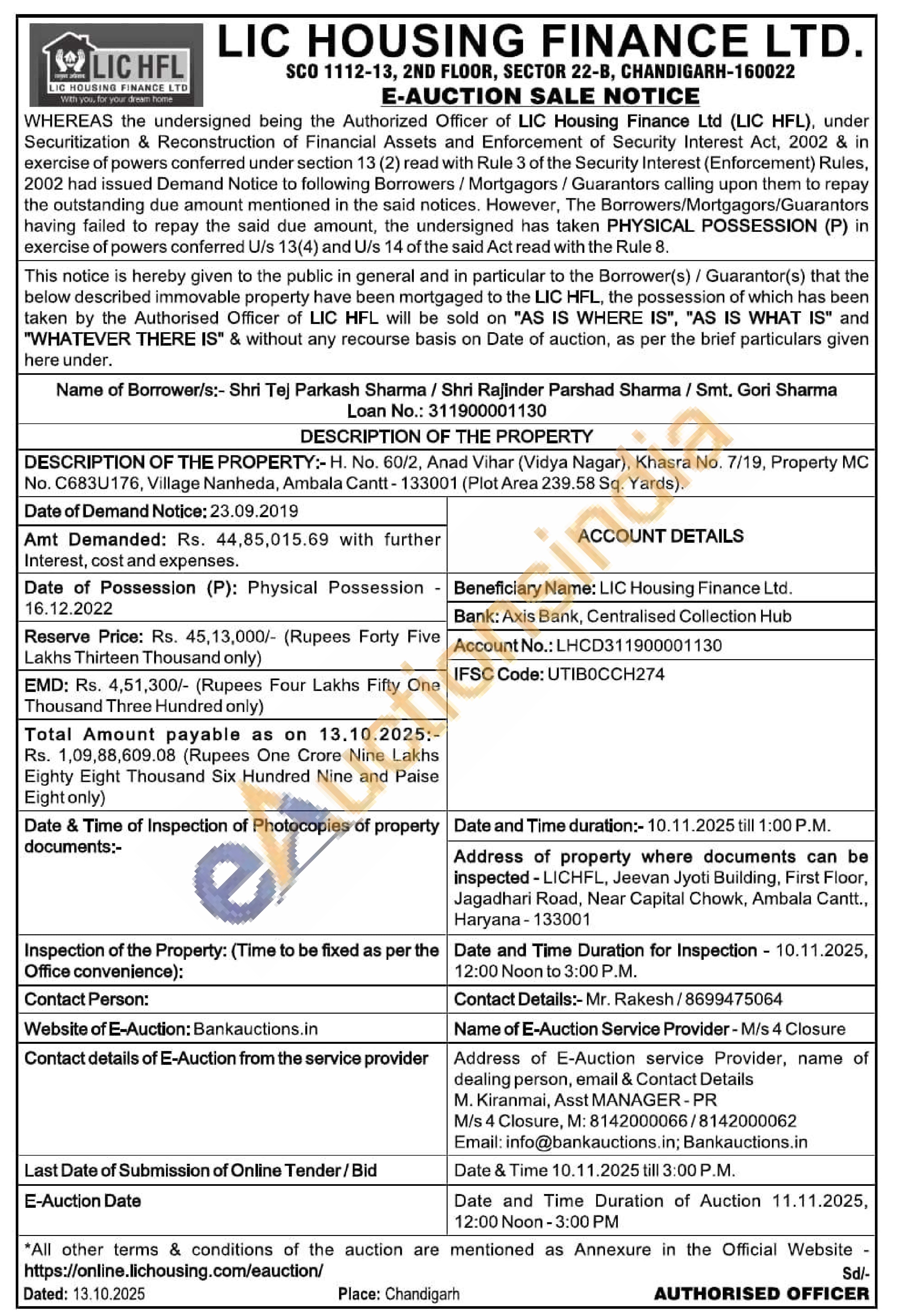 H. No. 60/2, Anad Vihar (Vidya Nagar), Khasra No. 7/19, Property MC No. C683U176, Village Nanheda, Ambala Cantt-133001 (Plot Area 239.58 Sq. Yards