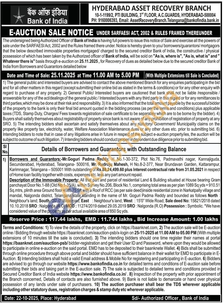 Description of the Immovable Property: All that part and parcel of residential Land & Building situated at House bearing Gram panchayat Door No.1-88 (Old No.1-35/A), within Survey No.206, Block No. 1, comprising total area as per plan 1089 Sq yds=910.51 Sq.mtrs, plinth area Ground floor 4085.75 Sft with a Roof of RCC (as per sale deed)inside residential zone in Narkatpally village and mandal, Nalgonda district, Telangana state standing in the name of Mr. Goguri Padma Reddy and bounded as follows North: Neighbour's land; South: 20'-0" Wide road; East: Neighbour's land; West: 15'0" Wide Road; Sale deed No: 15821/2018 dated 10.10.2018 SRO: Nalgonda (R.O) MOD: 11274/2019 dated 29.05.2019 SRO: Nalgonda (R.O) Possession: Symbolic. "We have considered value of the property as per actual available area of 850 Sq yds