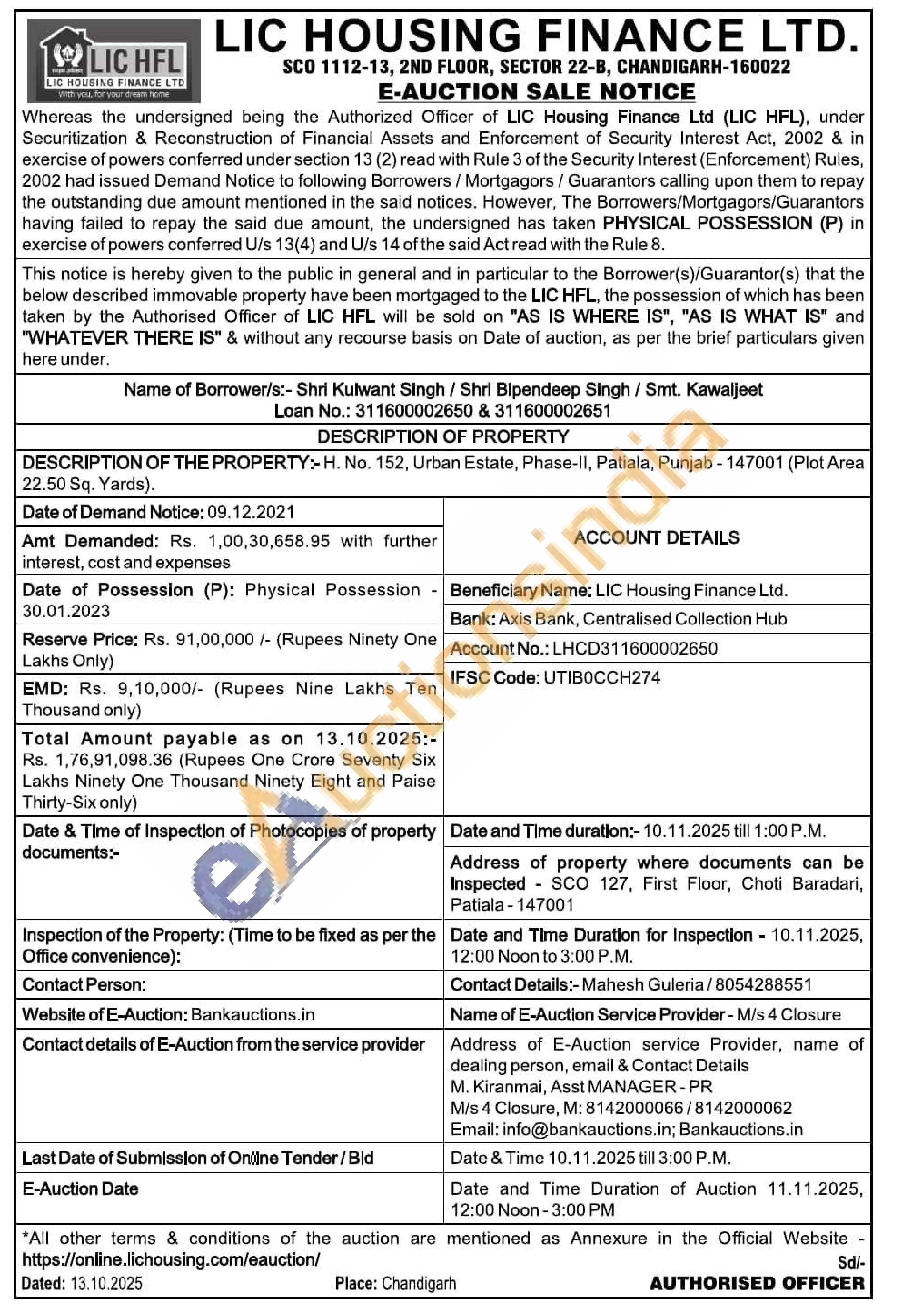 H. No. 152, Urban Estate, Phase-II, Patiala, Punjab-147001 (Plot Area 22.50 Sq. Yards).