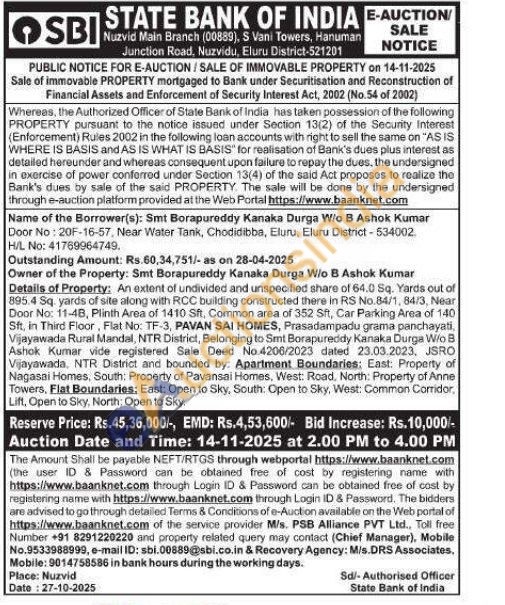 An extent of undivided and unspecified share of 64.0 Sq. Yards out of 895.4 Sq. yards of site along with RCC building constructed there in RS No.84/1, 84/3, Near Door No: 11-48, Plinth Area of 1410 Sft, Common area of 352 Sft, Car Parking Area of 140 Sft, in Third Floor, Flat No: TF-3, PAVAN SAI HOMES, Prasadampadu grama panchayati, Vijayawada Rural Mandal, NTR District, Belonging to Smt Borapureddy Kanaka Durga W/o B Ashok Kumar vide registered Sale Deed No.4206/2023 dated 23.03.2023, JSRO Vijayawada, NTR District and bounded by: Apartment Boundaries: East: Property of Nagasai Homes, South: Property of Pavansai Homes, West: Road, North: Property of Anne Towers, Flat Boundaries: East: Open to Sky, South: Open to Sky, West: Common Corridor, Lift, Open to Sky, North: Open to Sky