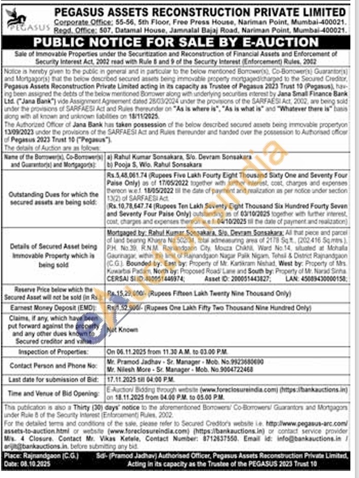 All that piece and parcel of land beanng Khasra No 502:34, total admeasuring area of 2178 S. (202416 Sqms) PH No.39, R.N.M. Rajnandgaon City, Mouza Chian, Ward No.14, situated at Mohalla Gaurnagar, within the limit of Rajnandgaon Nagar Palik Nigam, Tehsil & District Rajnandgaon (CG). Bounded by: East by: Property of Mr. Karikram Nishad, West by: Property of Mrs. Kunwarbai Padam, North by: Proposed Road Lane and South by: Property of Mr. Narad Sinha CERSAI SLID 400051445974