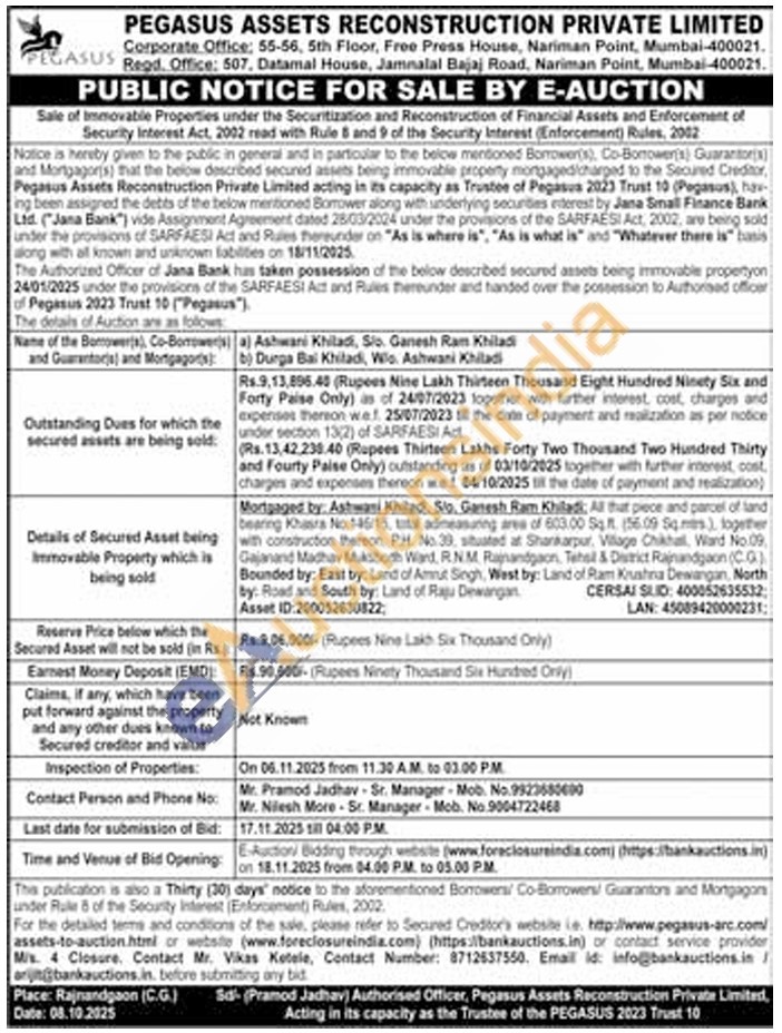 All that piece and parcel of land bearing Khasra No. 145/15, tanasuing area of 603.00 Sq.ft. (56.09 Sqmes), logetter with construction thereon, PH. No.39, situated at Shankarpur, Village Chikhall, Ward No.09. Gajanand Madhav Muksbodh Ward, R.N.M. Rajnandgaon The District Rajnandgaon (CG) Bounded by: East by: Land of Amrut Singh, West by: Land of Ram Krushna Dewangan, North By: Road and South by: Land of Raju Dewangan