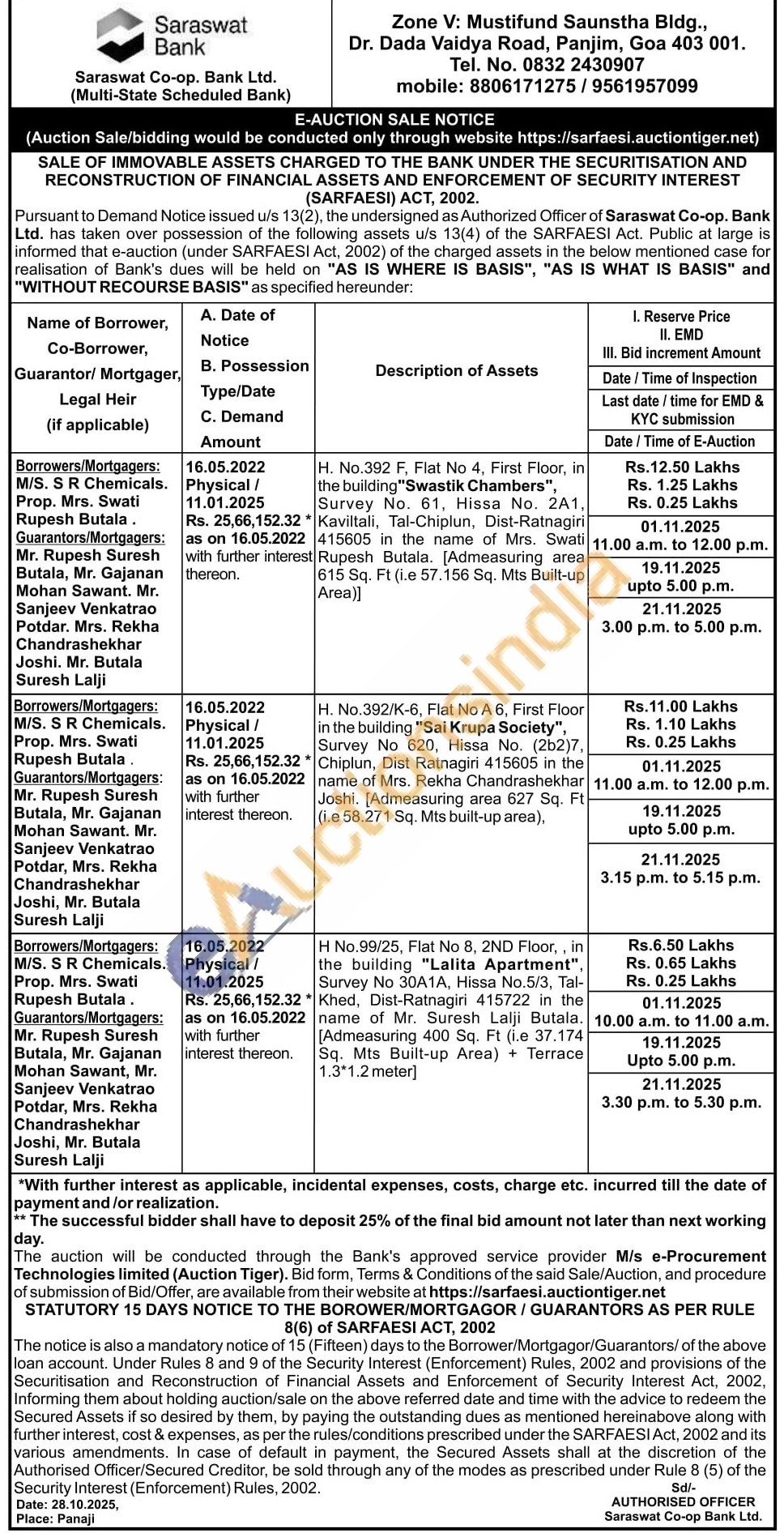 H. No.392 F. Flat No 4, First Floor, in the building"Swastik Chambers", Survey No. 61, Hissa No. 2A1, Kaviltali, Tal-Chiplun, Dist-Ratnagiri Rupesh Butala. [Admeasuring area 415605 in the name of Mrs. Swati 615 Sq. Ft (i.e 57.156 Sq. Mts Built-up Area)]