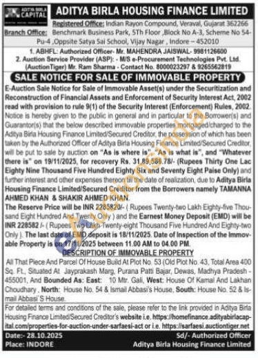 All That Piece And Parcel Of House Build At Plot No. 53 (Old Plot No. 43. Total Area 400 Sq. Ft, Situated At Jayprakash Marg, Purana Patti Bajar, Dewas, Madhya Pradesh-455001, And Bounded As: East: 10 Mtr. Gali, West: House Of Kamal And Lakhan Choudhary, North: House No. 54 & Ismail Abbasi's House, South: House No. 52 &ls mail Abbasi S House