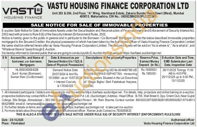 A Plot/house bearing UID No.604490788 UID No.604490SPAS100PH0778A measuring 308 sq. meters Situated in the Lal Dora Area of Village Bighar Distt Fatehabad Haryana, 125050,