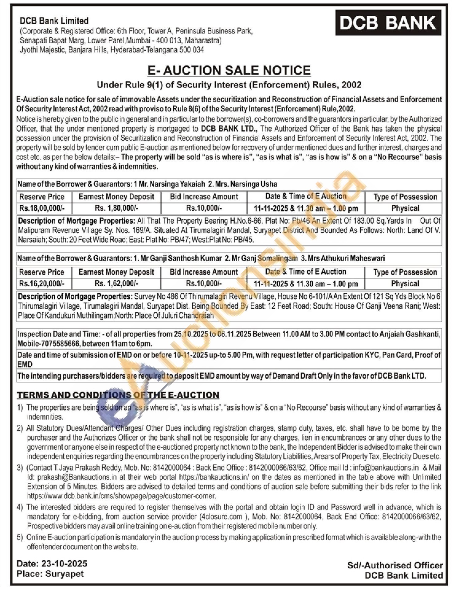Description of Mortgage Properties: Survey No 486 Of Thirumalagiri Revenu Village, House No 6-101/AAn Extent Of 121 Sq Yds Block No 6 Thirumalagiri Village, Tirumalagiri Mandal, Suryapet Dist. Being Bounded By East: 12 Feet Road; South: House Of Ganji Veena Rani; West: Place Of Kandukuri Muthilingam; North: Place Of Juluri Chandraiah