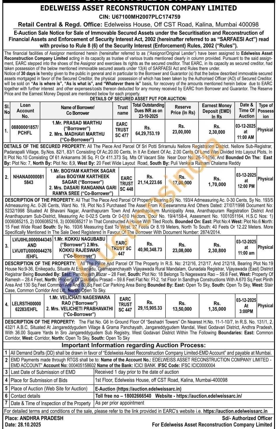 DESCRIPTION OF THE PROPERTY: All That The Piece And Parcel Of Property Bearing Sy No. 193/4 Admeasuring Ac. 0-30 Cents, Sy No. 193/5 Admeasuring Ac. 0-26 Cents, Ward No. 19, Plot No.5 Purchased The Asset From K Eeswramma And Others Dated: 27/07/1998 Document No: 5232/1998 Situated At Bhavani Nagar, Ananthapuram Town And Ananthapuram Municipality Area, Ananthapuram Registration District And Ananthapuram Sub-District, Measuring Ac 0-02.5 Cents Or 0-010 Hectors, Door No. 19/4/158-4, Assesment No. 1001051164, H.S.C Nos: 1) 0006085215, 2) 0006085216, 3) 0006085217 In That Constructed A House With Tiled Roofs. Bounded On: East: Plot No:4 West: Plot No.6 North: 15 Feet Wide Road South: Sy No. 193/6 Measuring East To West: 27 Feets Or 8.19 Meters, North To South: 40 Feets Or 12.22 Meters. More Specifically Mentioned In The Sale Deed Registered In Favour Of The Borrower With Document Number: 2874/2014.