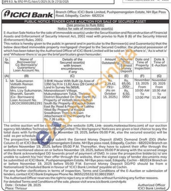3 BHK House With Built Up Area of 1350 Sq Ft in 11.82 Ares (29 Cents) of Land In Survey No.565/6 Manavalasseri Village, Mukundapuram Taluk, Thrissur District Bounded On The: North By: Property of Vettath Manmadhan South By: Property of Koppuli Balan East By: Road & Property of Lalitha West By: Property of Koppull Sreedharan There Is Known Attachement in The Property For Rs. 7.26 Lakhs