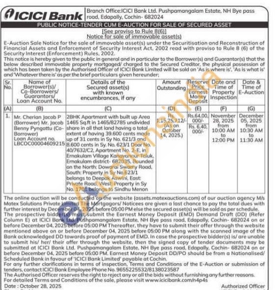 2BHK Apartment with built up Area 1465 Sq.ft in 1465/82785 undivided share in all that land having a total extent of having 39.600 cents mode up of 31 cents in Sy No. 621/3 and 8.600 cents in Sy. No. 623/1 Door No. 40/7632/C2, Apartment No. 2-E, in Ernakulam Village Kanayannur Toluk, Emakulam district- 682035, Bounded on the North: Dowarai Swamy Rood, South: Property in Sy No.623/1 belongs to Deepak Aswini, East Private Road, West: Property in Sy No. 1701 belongs to Sindhu Menon